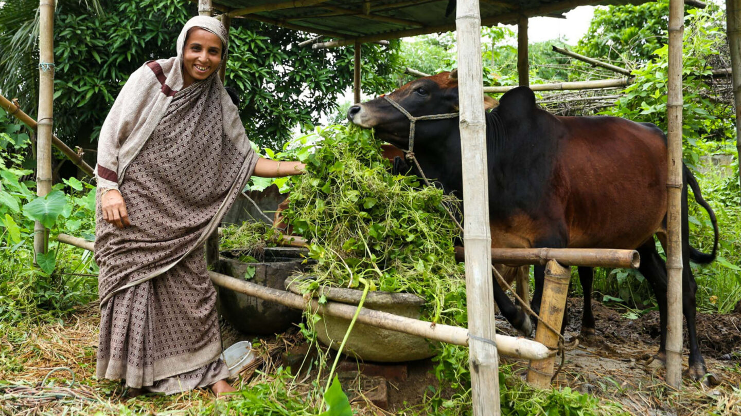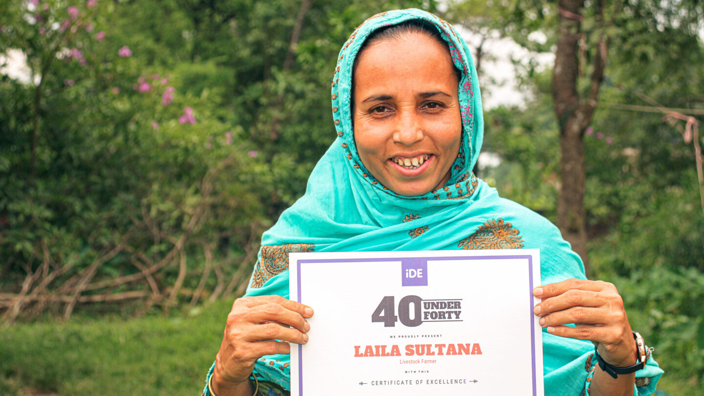 Laila Sultana is holding a 40 Under 40 certificate presented to her by the iDE Bangladesh management team for exemplifying the highest qualities of entrepreneurship: business savvy, courage, community-mindedness, innovation, leadership, and grit. Laila got her start in the livestock sector by purchasing one cow which she paid for by saving 5 cents a day for 3 years, combined with a microfinance loan.