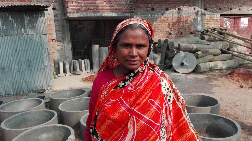 Nurjahan Begum stands in the courtyard of her workshop, where slabs and rings come together to form latrines to be sold in the Bogra district.