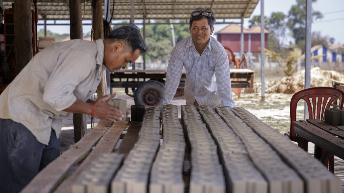 Khem Deourn uses a shovel to mix up a small pile of concrete. In a shaded spot beside his traditional house, the Cambodian, 50, dumps the damp concoction into a brick press and compacts it with a pull of a handle. Deourn then carefully removes a perfectly formed interlocking brick and places it at the end of a row of identical products on a table to dry. The process is repeated dozens of times throughout the day, as Deourn, who lives near the Vietnamese border in Svay Rieng Province, is busy meeting demand from community members who use the bricks to build fences around their homes.