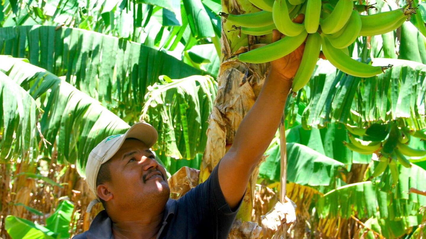 Francisco examines a plantain bunch. Better irrigation methods have produced not only better fruit but bigger fruit. (Photo by Chris Nicoletti/iDE)