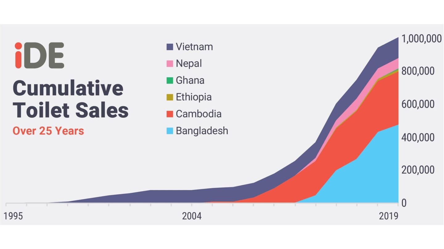 In 2019, iDE reached an incredible milestone: over one million toilets have been sold and installed by iDE trained and supported businesses involved in our “Building Markets for Sanitation” efforts. Today, that number is 1,077,970—making iDE's rural sanitation marketing program the world's largest.