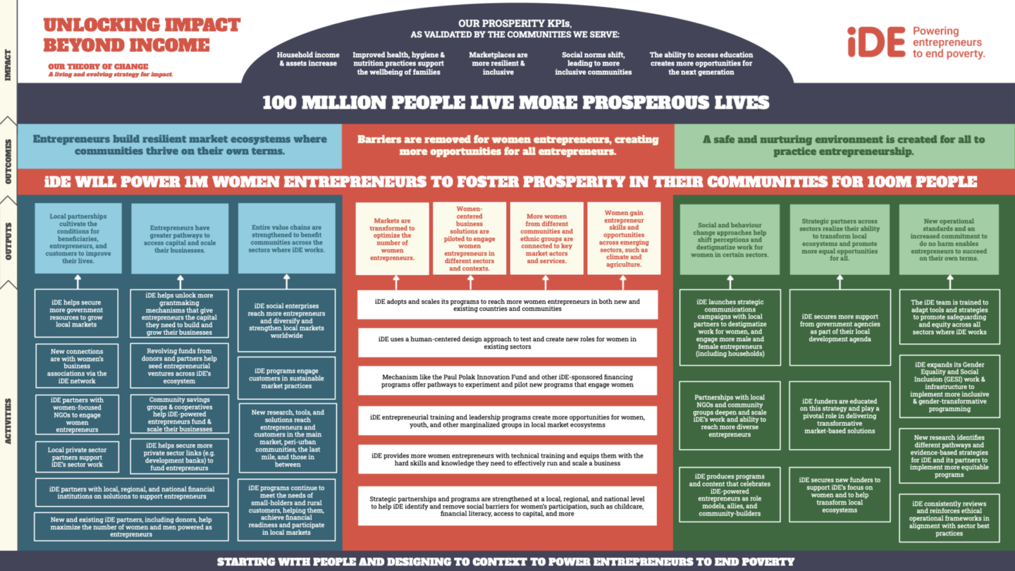 iDE’s Global Theory of Change lays out the ultimate impact iDE hopes to achieve, along with the short- and long-term outcomes necessary to get there. It is a living document, guided through a large-scale, participatory co-creation process across iDE’s business units and informed by iDE’s traction and work to date. It lays the foundation for iDE’s strategy, programs, and evaluation, and also: