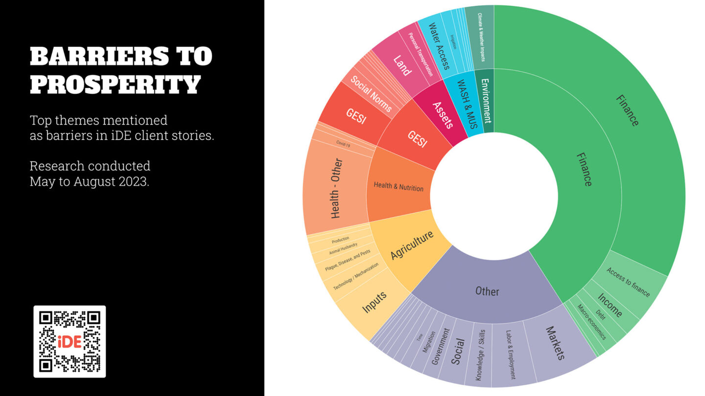 Given the lack of globally-available gender disaggregated data, iDE conducted a participatory data collection activity in 2023 that asks the question: “How do the people and households with whom we work define prosperity and what are their goals for the future?” iDE's purpose in conducting the research initiative was to underpin its forward-looking organizational strategy with an understanding of their client's perspectives.